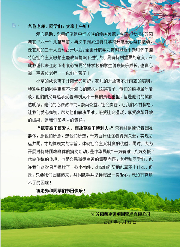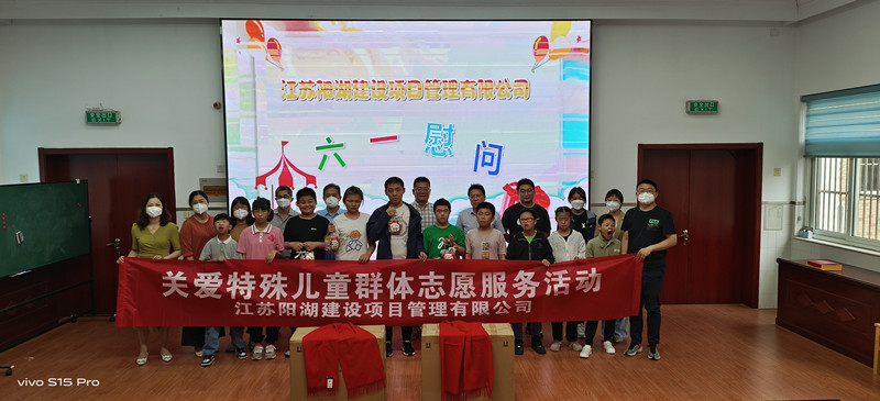 今天上午——2023“六一”国际儿童节到来之际,我江苏阳湖建设项目管理有限公司领导左军率党员职工代表邹小东、李朝霞等一行10人,照例来到位于滆湖中路18号的武进特殊学校,开展志愿服务活动,向在校师生们送去特殊的节日关爱和生活教学用品,受到学校领导以及特殊学生热烈欢迎。