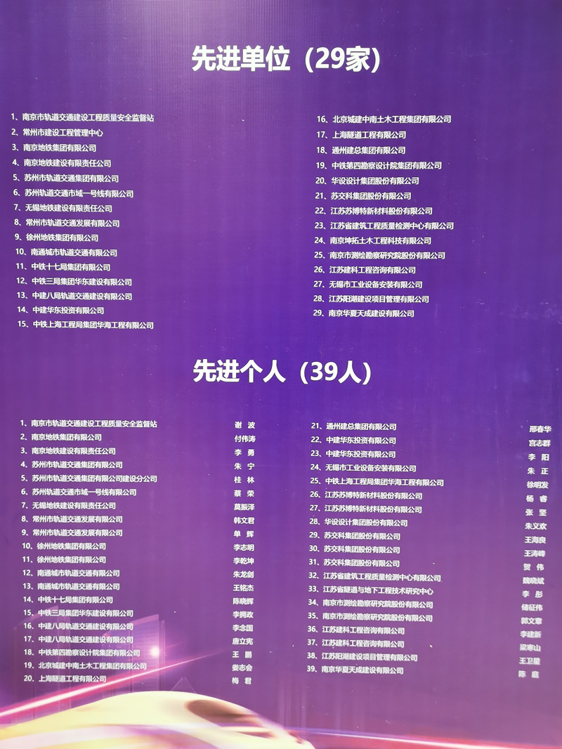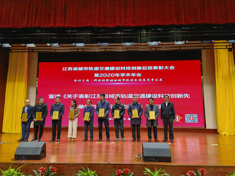 12月19日,江苏省城市轨道交通建设科技创新总结表彰大会暨2020年学术年会在南京召开,本次会议以“科技创新驱动城市轨道交 通高质量发展”为主题,来自住房和城乡建设部、省住房和城乡建设厅、省科学技术协会、中国土木工程学会、中国建筑出版传媒有限公司、省土木建筑学会,以及全省6个城轨在建城市的主管部门、质量安全监督机构、地铁公司、参建各方代表及科研院所等单位的嘉宾学者共300余人参加。