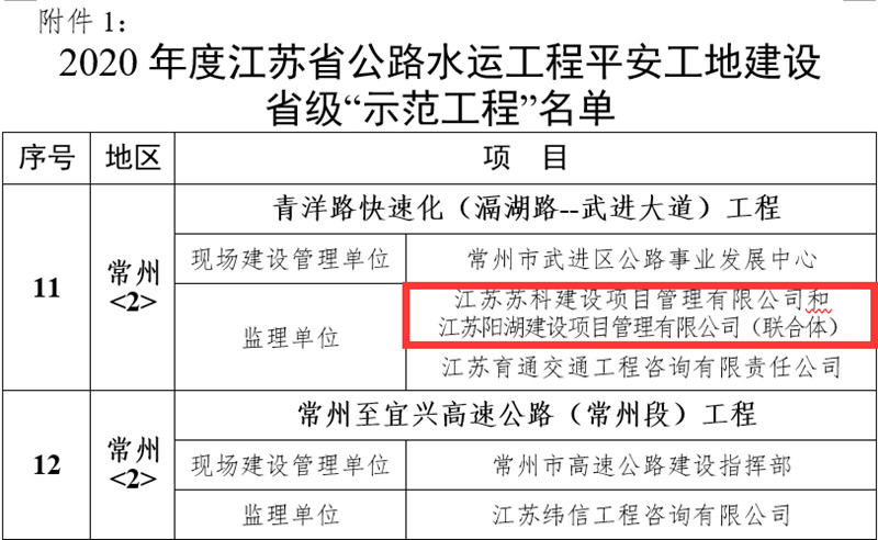 1月19日获悉,江苏省交通厅对全省在建的公路水运工程项目进行平安工程建设“示范工程”考核评比,由江苏阳湖建设项目管理有限公司承监的青洋路快速化工程监理项目获得2020年度江苏省公路水运工程平安工地建设“示范工程”。